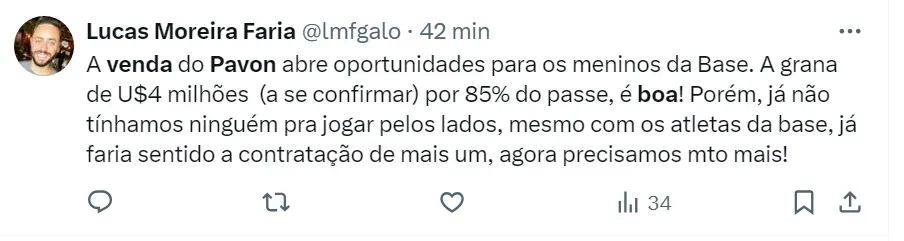 O Clube Mineiro ainda vai manter 15% dos direitos econômicos do jogador, segundo informações do jornalista. Foi um ótimo negócio feito pela diretoria do Galo. Ele também foi cogitado no Corinthians, mas o Alvinegro não fez nenhuma oferta.
