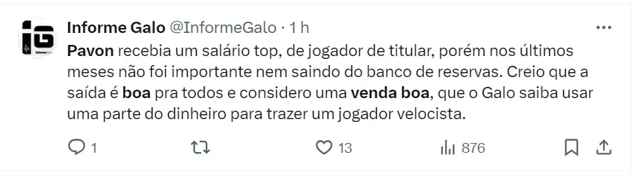 Com essas chegadas no sistema ofensivo, a diretoria do Galo acertou nesta quarta-feira (14) a venda do atacante Cristian Pavón para o Grêmio. O jogador argentino estava no Clube Mineiro desde julho de 2022, mas não deslanchou.