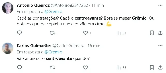 A direção gremista tem sido alvo de críticas de parte da torcida devido a uma suposta demora no anúncio de novas contratações. Até o momento, apenas dois reforços foram oficializados.