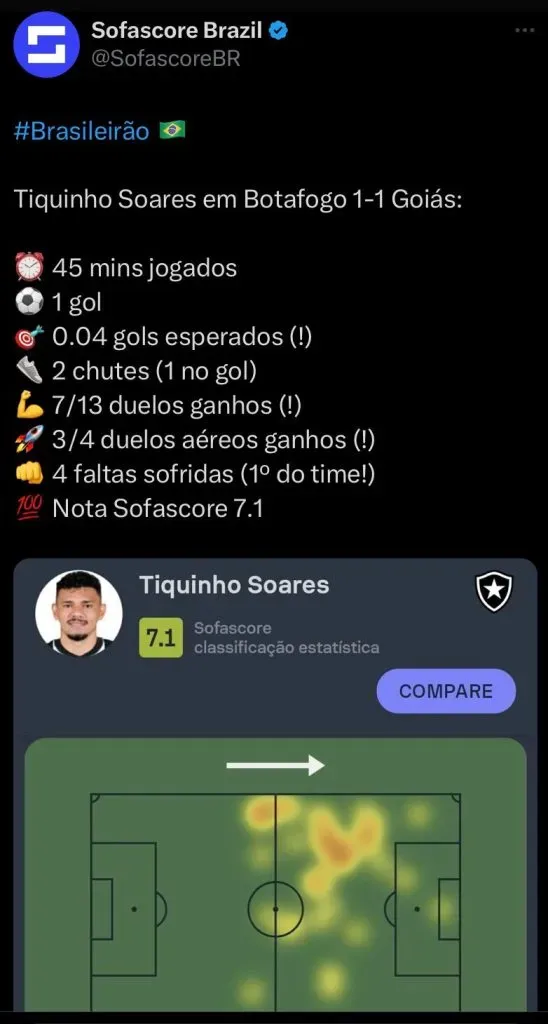 O resultado da péssima decisão do treinador do Botafogo, foi uma partida muito abaixo na primeira etapa e ao decidir colocar o camisa 9 do Glorioso no intervalo, a partida foi totalmente diferente e graças a Tiquinho Soares, que marcou um golaço de fora da área, o Fogão conseguiu sair de campo com mais um ponto somado na tabela.