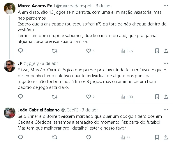 O técnico Eduardo Coudet reconheceu a necessidade de melhorias, admitindo que a equipe precisa dar mais e retomar aspectos importantes do jogo. A única vitória sobre equipes da Série A veio no Gre-Nal, mas mesmo esse resultado foi conquistado nos acréscimos, evidenciando a dificuldade do time em impor seu jogo.