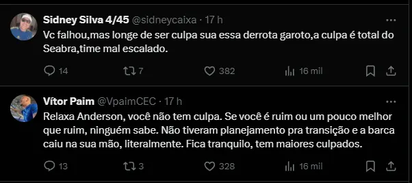 Dessa forma, Anderson também comentou sobre a partida pela competição continental: “é vida que segue e tem que erguer a cabeça porque, na terça-feira, tem uma partida muito importante“.