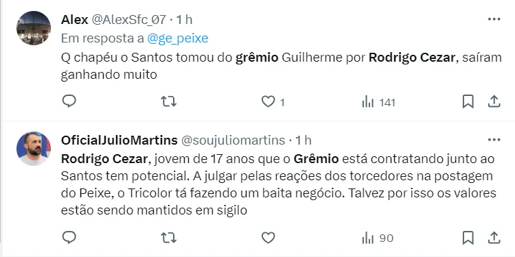 A informação foi dada pelo portal Diário do Peixe, e confirmada pelo GE. O empréstimo de Rodrigo Cezar ao Grêmio será com valor de compra fixado. Os valores não foram revelados pelos clubes.