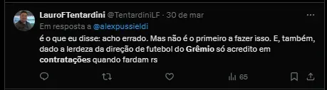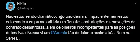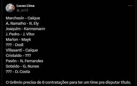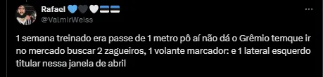 Ainda foi relatado que Renato Gaúcho e sua comissão técnica também tem muito impacto nas decisões das contratações do Clube. Vamos aguardar para saber o que vai acontecer no meio do ano sobre reforços que vão chegar.