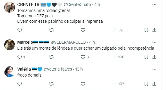 “Não sei se a palavra é desprestigiado, mas o Grêmio está extremamente preocupado com o que vem acontecendo. Quero deixar bem claro para a torcida que não vão tirar o campeonato (Gauchão) do Grêmio na mão grande. Talvez não seja interessante para um todo o heptacampeonato do Grêmio, depois do Novo Hamburgo ter ganhado um título e o Inter estar há tanto tempo sem ser campeão“.