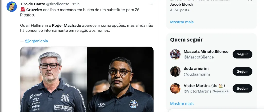 Só que, há pouco, reportagem do jornal O TEMPO veio com a informação bombástica de que há outro técnico que ganhou força nas últimas horas e até passou a escolha por Luxemburgo. Trata-se de Roger Machado.