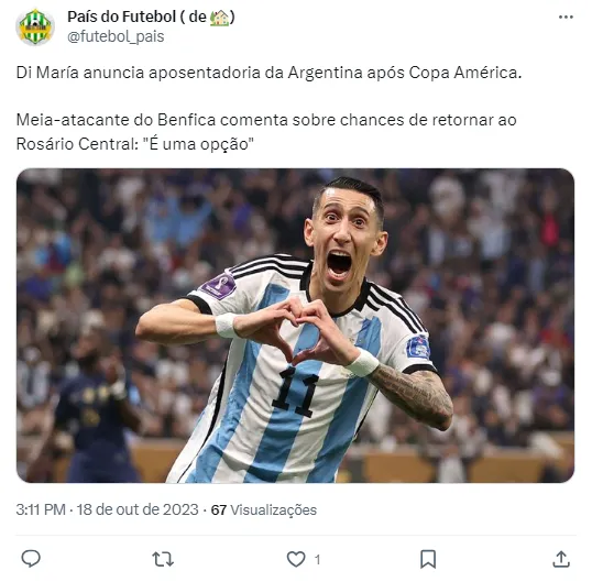 Isso porque o atacante Di Maria admitiu em entrevista coletiva que está se aposentando da Seleção Argentina. O craque dono de um vasto currículo, campeão Mundial, da Champions League, do Campeonato Espanhol, Português e mais, agora se dedicará apenas a equipes. E por falar nisso, o ponta-direita que tanto foi cotado no futebol brasileiro na última janela de transferências, pode estar de saída do Benfica de Lisboa.