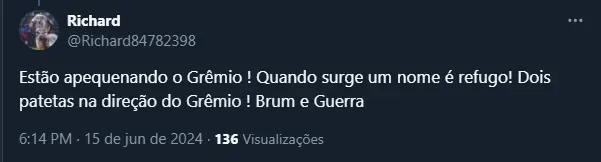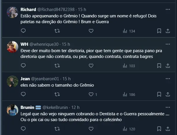 Vale lembrar que o Tricolor Gaúcho perdeu os últimos três jogos seguidos e aparece com apenas seis pontos, perto da zona de rebaixamento do torneio. Até por isso, os torcedores estão cobrando fortemente a direção do Imortal.