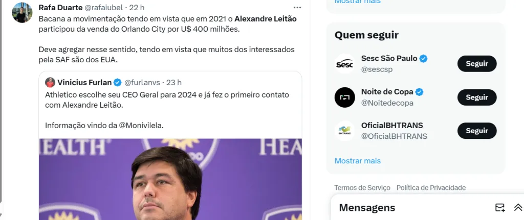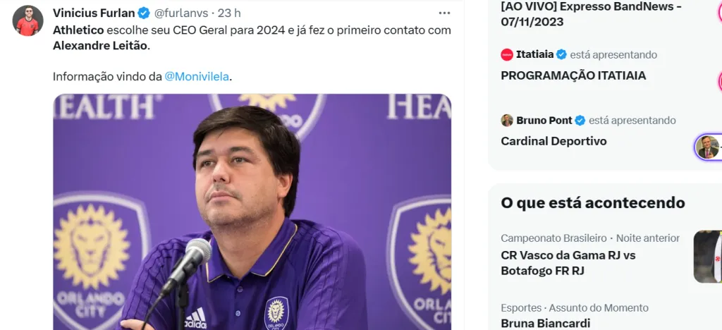 Reportagem das setoristas Monique Vilela e Nadja Mauad informam que Alexandre Leitão, ex-CEO do Orlando City, dos EUA, está em negociações encaminhadas para desempenhar a função em Curitiba.