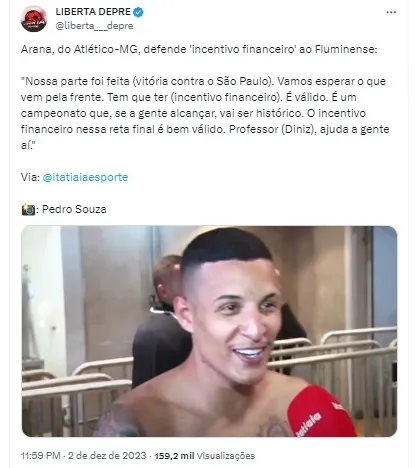 Diante disso, após a partida do Galo, o lateral Guilherme Arana pediu uma ajudinha ao Tricolor e ‘defende incentivo’ financeiro: “Nossa parte foi a vitória contra o São Paulo. Vamos esperar o que vem pela frente. Tem que ter incentivo financeiro. É válido”, iniciou o camisa 13 à Itatiaia.