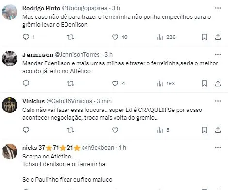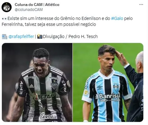 Neste contexto, o Galo sabe que, assim como busca reforços, também é vitrine e pode perder alguns de seus jogadores. Na última quarta-feira (15), veio à tona que Edenílson entrou no radar do Grêmio, em uma possível negociação com a equipe gaúcha.