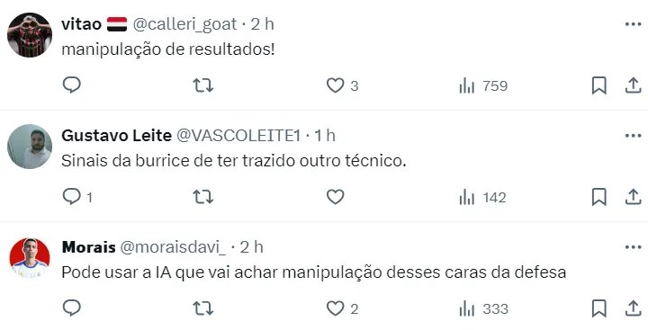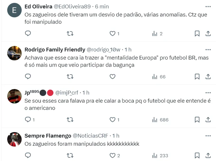 “Foi uma performance patética do time hoje. Nossos capitães sabem. Temos um novo treinador chegando. Abrimos uma competição maravilhosa, com uma performance horrorosa”, lamentou o dono da SAF após o jogo.