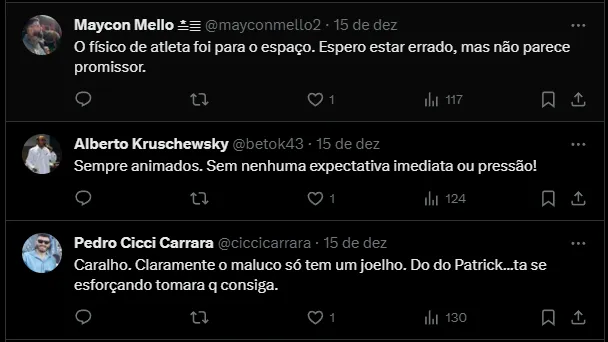Atualmente, o volante de 24 anos está na fase de reequilíbrio muscular, assim, almeja voltar aos treinos em campo o mais rápido possível. Ainda não há uma data exata para o retorno de Patrick de Paula.