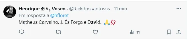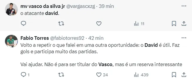 David estava no Internacional e foi contratado no início desta temporada por empréstimo. O elenco vascaíno ficou quase um mês sem entrar em campo devido a eliminação na semifinal do Carioca para o Nova Iguaçu.