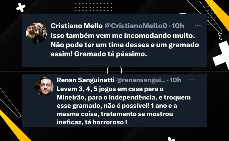 “A gente tem consciência, a gente reconhece que o gramado está muito ruim, e para consertar, primeiro, saber que está ruim. Primeiro, tem que reconhecer o erro. Mas estamos aí para fazer a troca de todo gramado”, disse Sérgio Coelho à Itatiaia.