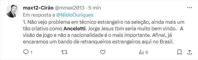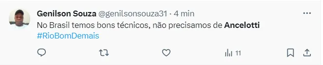 Lembrando que, Ednaldo Rodrigues, em julho, garantiu que Ancelotti seria o treinador do Brasil a partir da Copa América de 2024: “Ele vai estar, pode ter certeza”, disse ex-presidente da CBF na época.