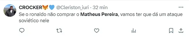 Na saída de campo, Matheus Pereira disse à Rede Globo que sua compra no Cruzeiro dependeria de seu rendimento, e ainda brincou: “Pergunta para Martins se está valendo a pena, se pode me contratar ou não”, se referindo o diretor do clube. Confira o vídeo na íntegra abaixo.