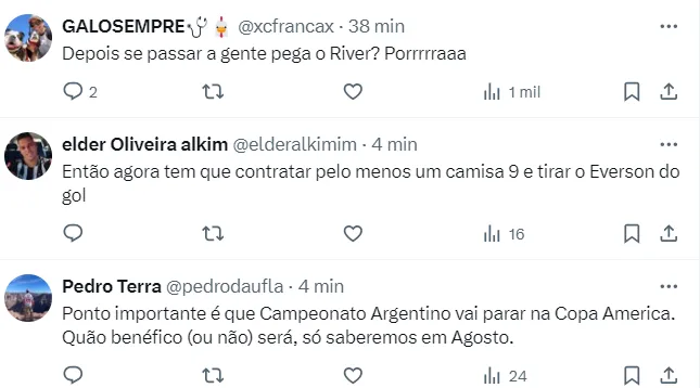 O apresentador Thiago Asmar, conhecido como Pilhado, foi enfático ao cravar que o Atlético-MG será o finalista da Libertadores. No caminho do Galo até a final, o jornalista acredita que o Alvinegro passará por Fluminense e River Plate, para chegar na grande decisão.