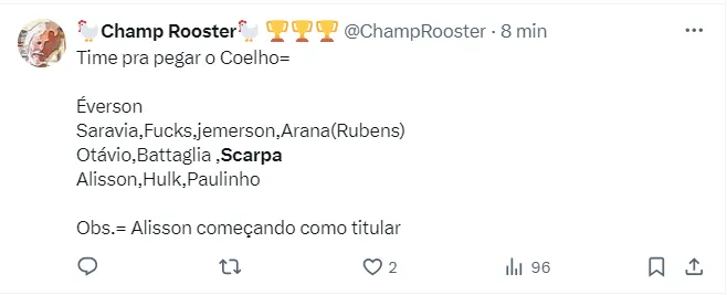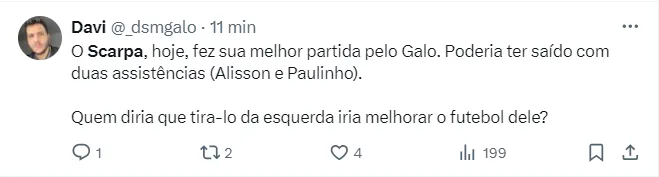 Quem esteve em campo durante os 90 minutos de jogo foi o meio-campista Gustavo Scarpa. O jogador foi contratado nesta janela de transferências pelo Galo por R$ 27 milhões, vindo do Nottingham Forest.