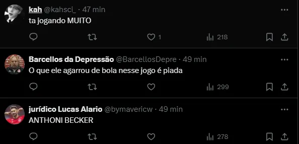 “Anthoni fazendo jogo da vida que isso“, “Boa notícia do jogo de hoje: Anthoni. JOGOU MUITO“, “O que ele agarrou de bola nesse jogo é piada” e “Anthoni Becker“, foram alguns comentários.