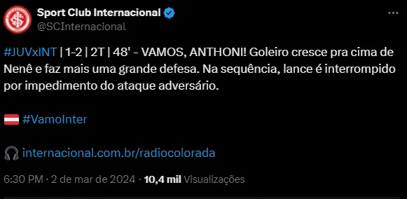 Nas redes sociais, os torcedores do Internacional foram a loucura com a atuação de Anthoni e elogiaram muito o jovem arqueiro do Colorado, que agora ganha mais moral, mesmo com o Inter procurando Jandrei.