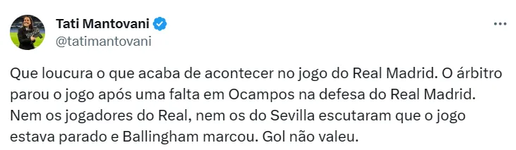 Neste sábado, a bola rolou para Real Madrid e Sevilla e como esperado, foi uma partida tensa e cheia de acontecimentos. Um deles foi a anulação do gol de Bellingham, que chegou a balançar as redes, mas o árbitro paralisou e nenhum dos dois times parou a jogada, que prosseguiu até a bola ir para a rede. O juiz acabou não validando o gol, para a irritação de Carlo Ancelotti.