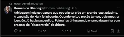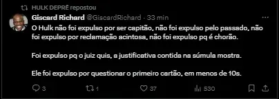 Hulk não ficou em silêncio após o ocorrido e se manifestou sobre o caso. Ele destacou que todos podem rever o lance, mas podem observar que em momento algum ele desrespeita o juiz da partida.
