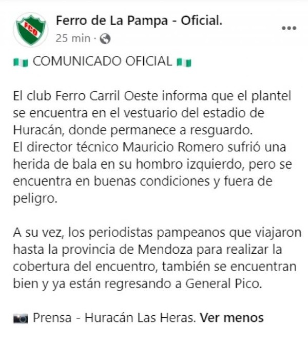 A equipe de Romero emitiu um breve comunicado no qual procuraram trazer tranquilidade aos familiares do treinador. “O clube Ferro Carril Oeste informa que o técnico Mauricio Romero está em boas condições e fora de perigo. Depois de sair do estádio, ele foi atendido em uma unidade hospitalar local”, dizia o comunicado por meio das redes sociais.