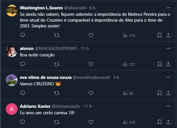“Cada vez mais a gente está se entendendo, temos nos entrosado. Nos concentramos juntos, falamos como podemos jogar, do que podemos fazer. Isso é importante para nós e para o Cruzeiro”, disse.