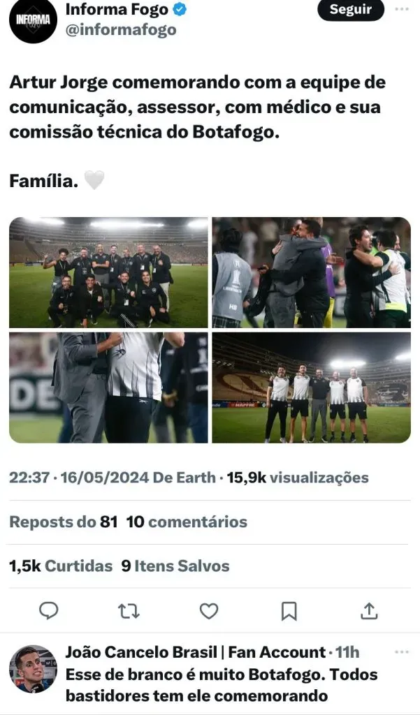 O treinador Artur Jorge falou em coletiva se o sucesso de treinadores portugueses contribui para isso: “Aquilo que nós avaliamos enquanto técnicos é a competência, não a nacionalidade. Venho de um país que vem tendo sucesso mundo afora e eu espero ser mais um a ter sucesso aqui.”
