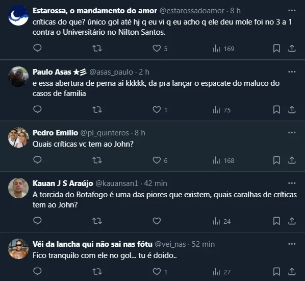“Queremos ter um elenco competitivo. Queremos ter o grupo em condições de disputar a titularidade. Neste momento, ele joga. Muito do momento tem a ver com o nível de treinamento do Gatito. Nenhum dos que jogam atualmente podem facilitar pois tem gente que tem vontade e ambição de ser titular do Botafogo”, disse.