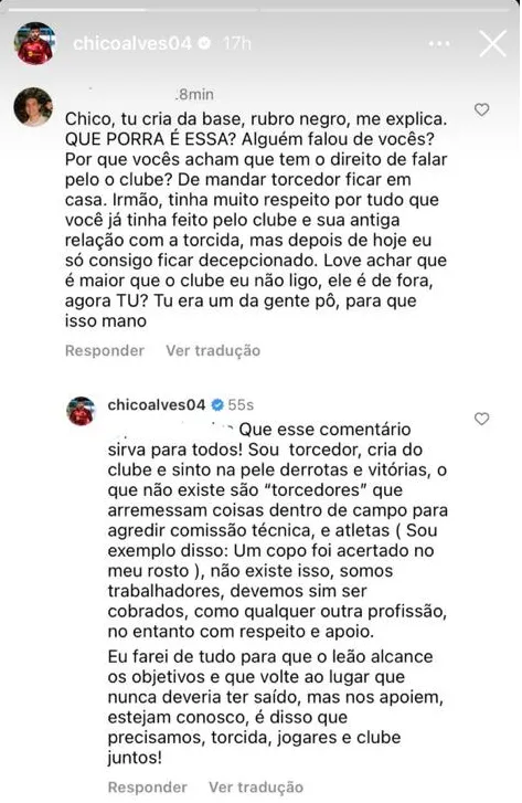 Um dos jogadores que participaram desse desabafo coletivo, o zagueiro Chico, também expressou sua posição nas redes sociais, em resposta a um torcedor que questionou sua atitude. Chico destacou seu papel de torcedor e sua ligação com o clube, enfatizando que a verdadeira torcida não envolve atitudes agressivas, como atirar objetos dentro de campo para atacar a comissão técnica e os jogadores.