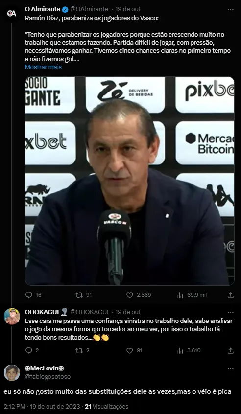 “Eu gosto muito do Ramón Díaz, mas as mudanças dele são trágicas. Ele pensa uma coisa e acontece outra. A gente está muito chateado porque o Vasco perdeu um jogo em que ele foi melhor, mas foi muito a partir das mudanças… Tirar o Zé Gabriel que é um dos atletas com mais fôlego, mais físico, não é característica do Jair compor a zaga.”, disse Edmundo.