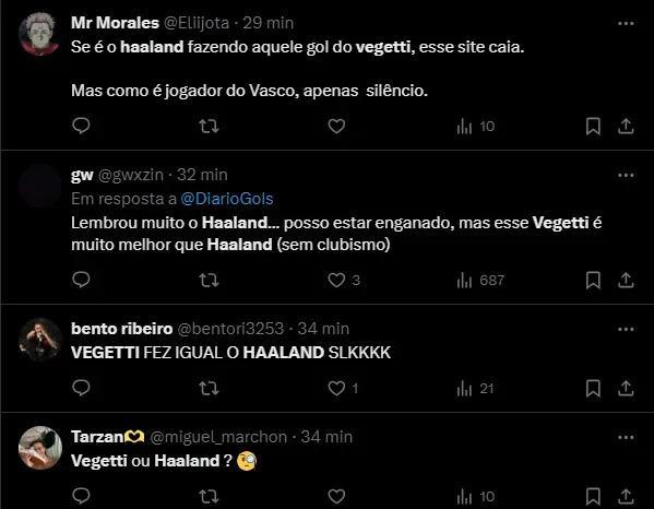 “Na minha opinião Vegetti já superou haaland”, “Vegetti vive do seu momento de Haaland em São Januário”, “Não sei se estou vendo o Vegetti ou o Haaland” e “EU OLHO PRO VEGETTI E VEJO O HAALAND“, foram alguns dos comentários.