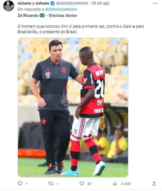 Zé Ricardo lançou Vini Jr. no profissional do Flamengo, em 2017, justamente contra o Atlético-MG, rival do Zeiro. Importante ressaltar, que o treinador acompanhava Vini desde as categorias de base e quando o jogador fez seu primeiro gol como profissional, em agosto daquele ano, não se esqueceu de lembrar do ‘padrinho’.