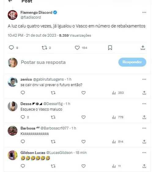 Alguns torcedores acabaram caindo na brincadeira, outros, os vascaínos, não gostaram do comentário. No entanto, o torcedor que fez a postagem não perdeu a oportunidade de brincar com a torcida rival. Contudo, agora, Botafogo e Athletico-PR tiveram o jogo suspenso e terminaram em 1 a 1. O jogo será remarcado para outra data.
