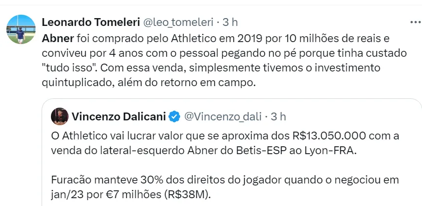 No ano passado, o Athletico Paranaense acertou a venda do lateral Abner Vinícius para o Real Betis, da Espanha, e preservou 30% dos direitos econômicos do atleta. Agora, o jogador de 23 anos deve gerar lucro ao time do Paraná.