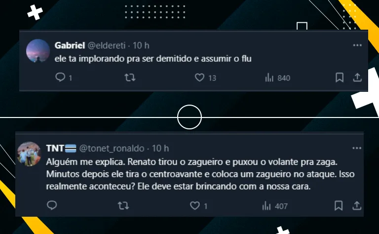 Isso porque, ainda no primeiro tempo de jogo, o desempenho ruim fez Renato optar por tirar Pavón e Everton Galdino ainda no primeiro tempo. Com pouco mais de 30 minutos, o ídolo colocou Nathan Fernandes e Gustavo Nunes na cancha.