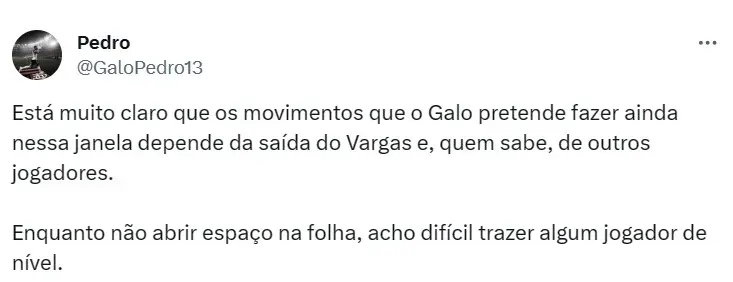 Segundo informações do jornalista Thiago Fernandes, o Galo não deve fazer jogo duro para liberar Vargas e pode abrir mão do chileno de forma gratuita, desde que o novo clube pague 100% do salário do jogador.