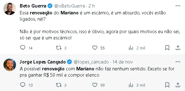 Apesar das boas notícias, a renovação de Mariano tem sido alvo de contestações por parte da torcida, que expressa preocupações sobre o rendimento do lateral, considerando sua idade avançada e o declínio em sua performance.