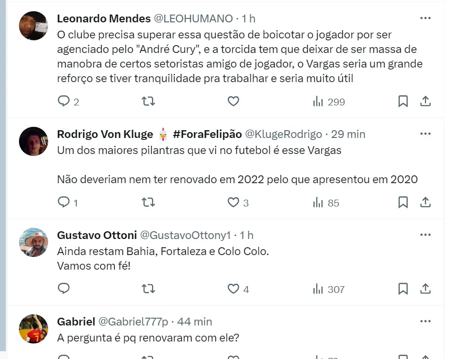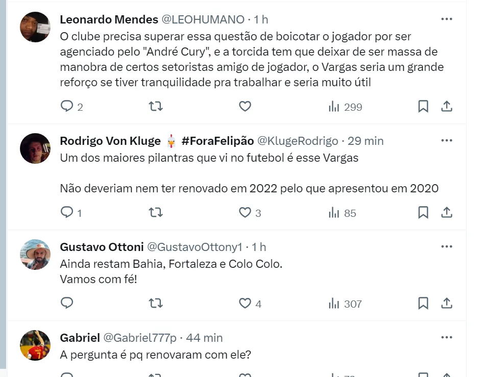 O jogador de 34 anos chegou a ser ventilado no Vasco, mas a negociação não avançou. Um problema para os interessados em Vargas é o seu alto salário: cerca de R$ 900 mil mensais.