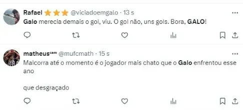 “Galo muito displicente, em ritmo de treino. Precisa mais efetividade, jogo tá fácil. Com um pouco mais de seriedade e concentração, serão 3 pontos mais“, comentou outro apaixonado pelo time mineiro.