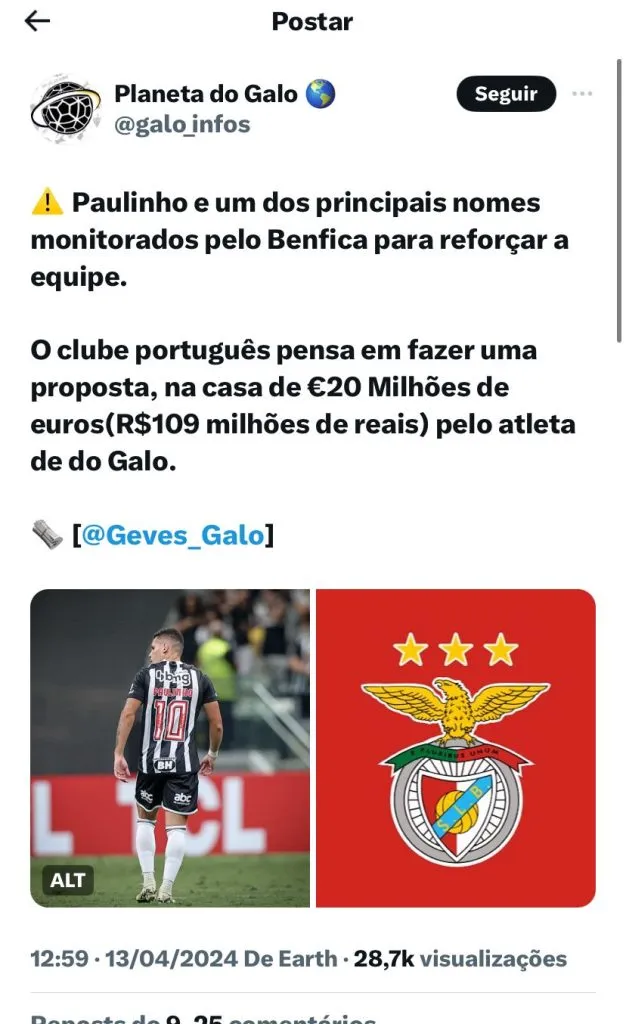 Neste sábado (13), o canal “Bica Galo” revelou que o atacante do Atlético Mineiro, Paulinho, está na mira do Benfica. Segundo a mesma fonte, o time português está monitorando a situação do camisa 10.