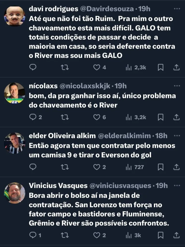 Além disso, as oitavas da competição terão alguns confrontos interessantes, como Palmeiras e Botafogo. São Paulo e Nacional. Bolívar e Flamengo, que estavam no mesmo grupo. E, também, um confronto argentino entre River Plate e Talleres.