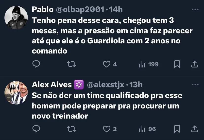 Mas, apesar disso, ele tem apenas duas derrotas até o momento. Em 16 jogos no comando do Clube, são cinco empates, nove vitórias e dois revés. O treinador argentino também conquistou o título Mineiro com o Galo, com um empate e uma vitória sobre o rival, Cruzeiro.