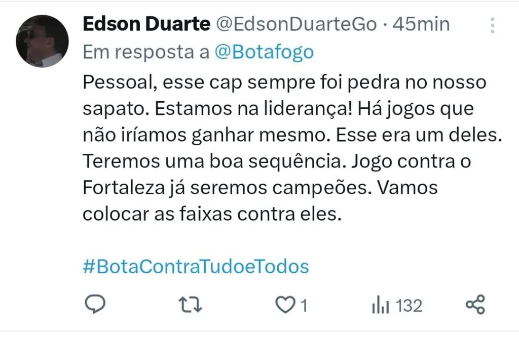Existe a possibilidade de que o duelo contra o Fortaleza na terça-feira (24), na Arena Castelão, fosse adiado, mas o volante destacou que prefere que a partida seja mantida. “Pra gente é sempre bom jogar, manter o ritmo. Se não acontecer, vai ser jogado lá para frente, vamos ficar com um jogo a menos, então preferimos jogar, é óbvio. É importante a gente jogar sim.”.