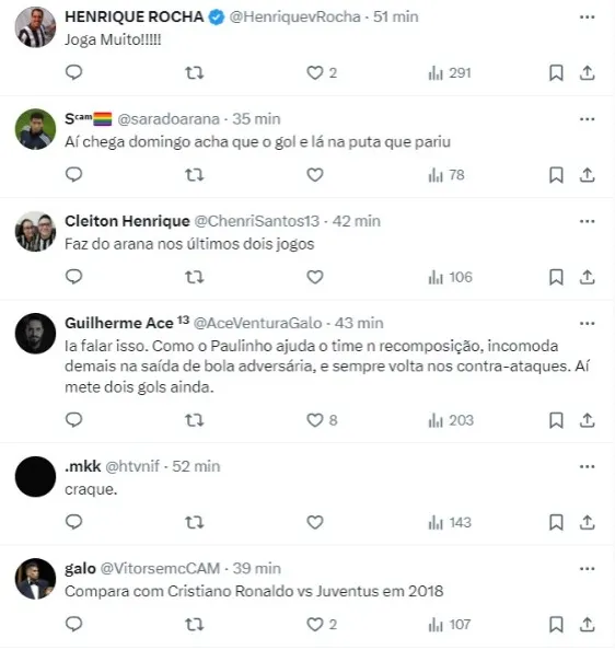 Guilherme Arana, que marcou um dos gols, foi bastante elogiado pela torcida nas redes sociais. A situação não foi diferente com Paulinho, autor de dois gols e uma atuação memorável.
