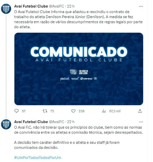 “O Avaí Futebol Clube informa que afastou e rescindiu o contrato de trabalho do atleta Denílson Pereira Júnior (Denílson). A medida se fez necessária em razão de vários descumprimentos de regras legais por parte do atleta.