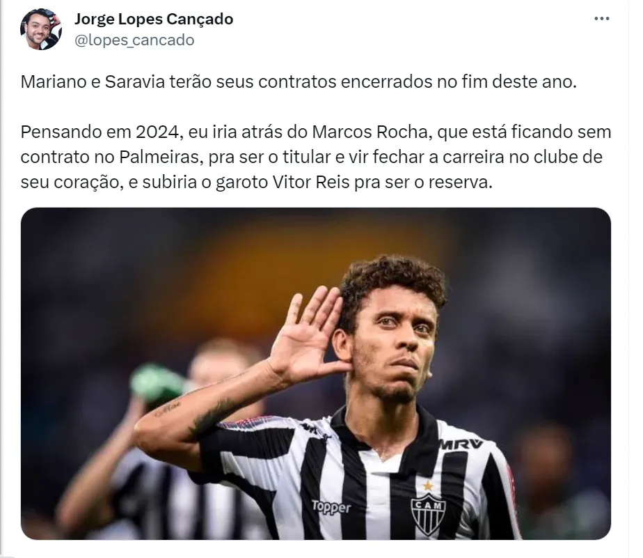Já Mariano e Saravia revezam na lateral-direita do Atlético-MG e estão longe de ser unanimidade. Por fim, o meia Hyoran está no Alvinegro desde 2020 e, mesmo não sendo titular do treinador Felipão, é bastante utilizado: atuou em 12 jogos do atual Campeonato Brasileiro. Enquanto não define o futuro desses jogadores, o Galo tem como meta no fim desta temporada subir na tabela da Série A e se classificar para a Copa Libertadores de 2024.