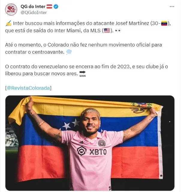 Tata Martino, técnico do Inter Miami, revelou que Josef Martinez não seguirá no clube em 2024. Ele foi procurado no inicio do ano, mas a equipe estadunidense não quis a liberação. A possível chegada de Soares foi determinante para isso acontecer. Apesar disso, de acordo com a Revista Colorada, Internacional já fez o contato e pode fechar com atleta.